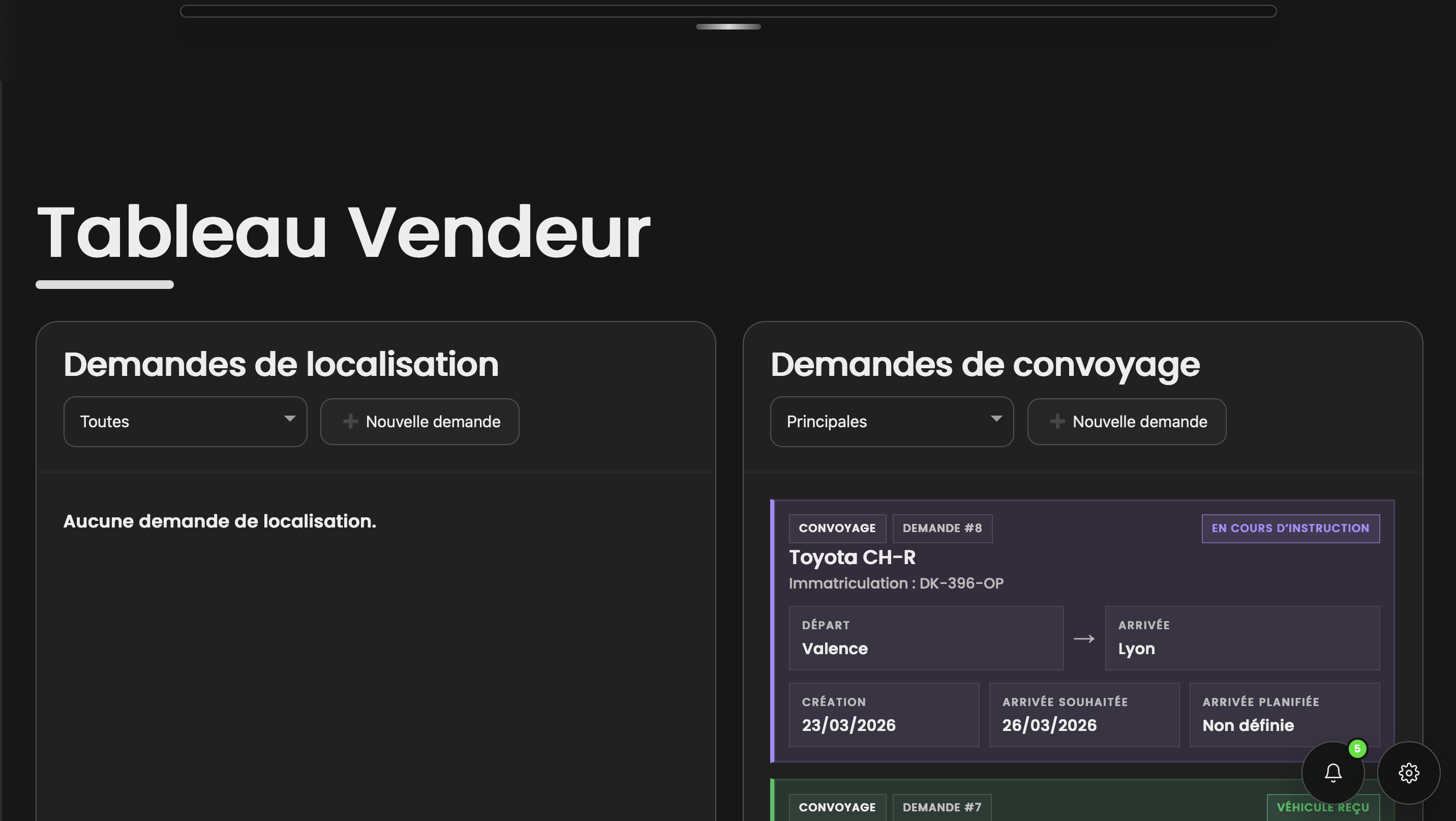 Un vendeur crée une demande de convoi en quelques clics depuis sa concession. Le transporteur la reçoit, planifie, assigne. Chaque étape est enregistrée — de la commande à la livraison.